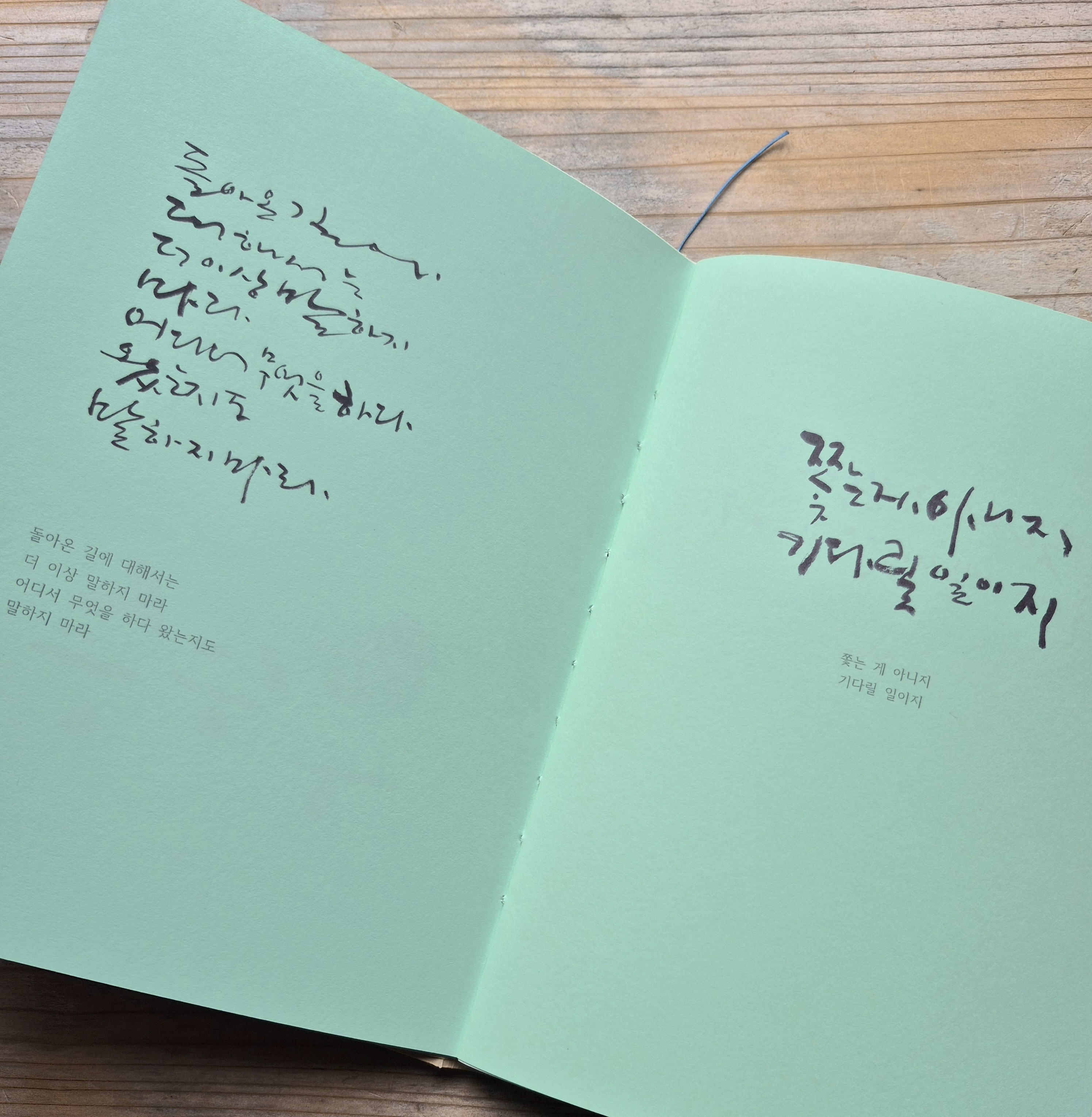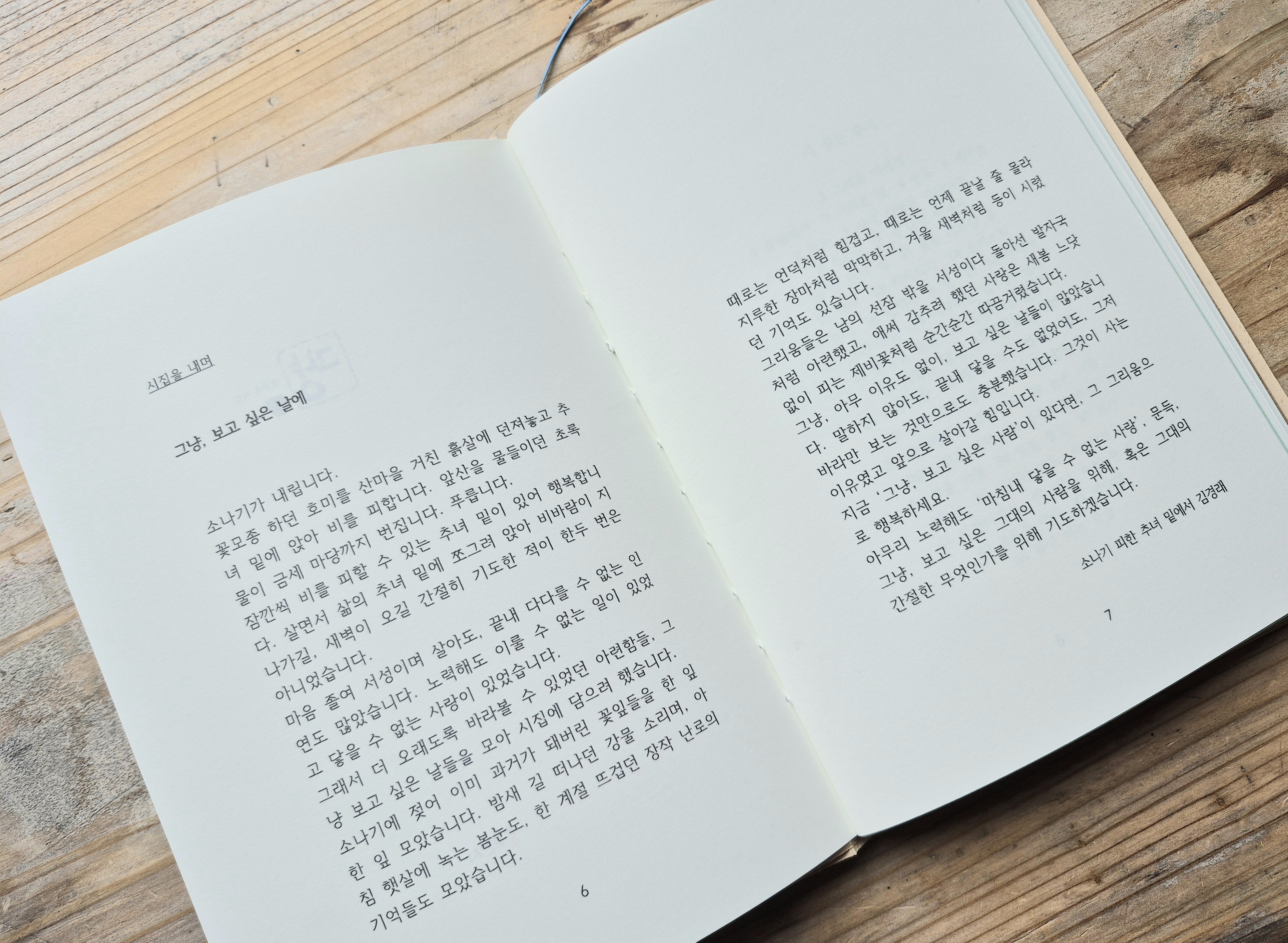 원고 만드는 일은 늘 했던 일이고 편집 디자인은 한글(hwp)로 작업하고 인쇄는 집에 있는 프린터기면 충분히 해결할 수 있었다. 제본은 북바인딩으로 하여 카페 손님들께 판매할 계획을 세웠다. 지금까지 카페에서 시집을 팔아오고 있는데 서점보다 잘 팔린다.