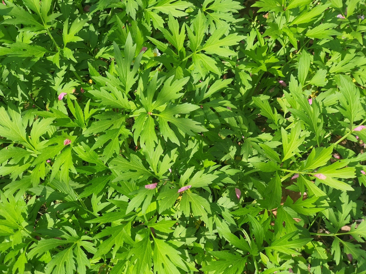 잎은 3~5개로 갈라져 마치 삼(대마)잎처럼 보입니다. 잎 가장자리에는 톱니가 있습니다.