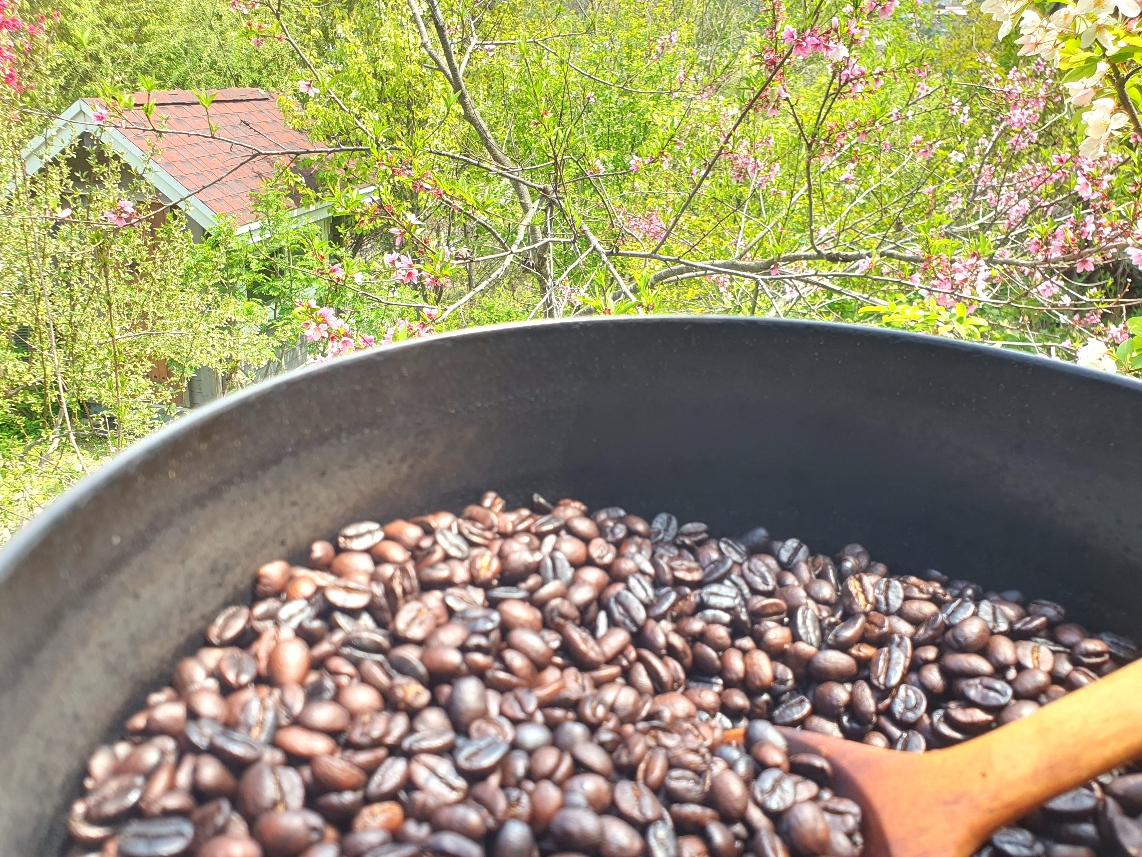 무쇠솥에 커피를 볶는 일이 처음엔 쉽지 않았습니다. 불 위에 무쇠솥을 올려 달구고, 원두를 넣어 나무주걱으로 타지 않게 쉼 없이 저어야 합니다. 불 조절을 못해 태워 먹기도 하고, 덜 볶기도 했습니다. 게다가 볶는 동안 나오는 가스와 연기는 머리를 어지럽게 할 정도로 심했습니다.