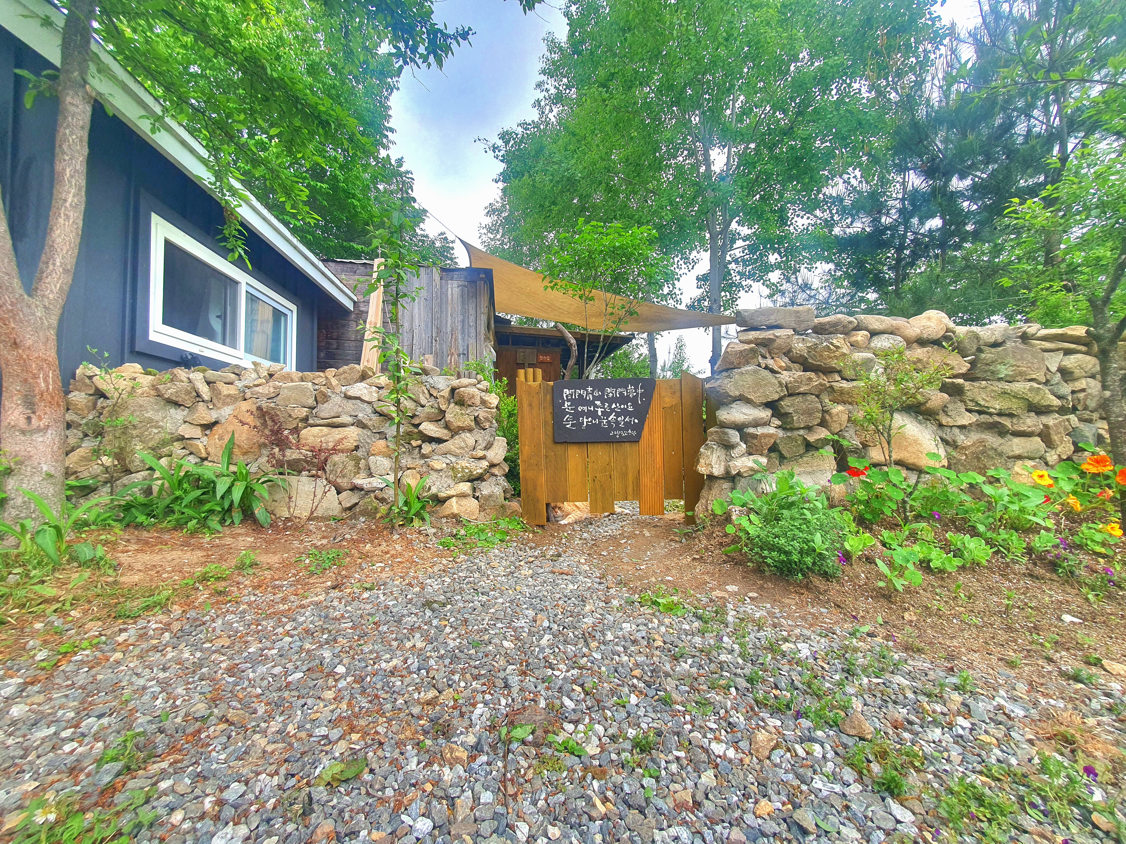 그래서 마당에 굴러다니는 돌들을 모아 돌담을 쌓았습니다. 강원도는 마당에도 돌이 많이 나옵니다. 한쪽에 모아 두었다 화단 경계를 만드는 등 필요할 때 사용합니다. 돌담을 쌓고 사립문을 달려고 했는데 너무 어지러울 듯 해 생각을 바꿨습니다. 어느 날 또 생각이 바뀌어 사립문으로 변덕을 부릴지 모르겠지만, 우선 폐자재를 이용하기로 했습니다.