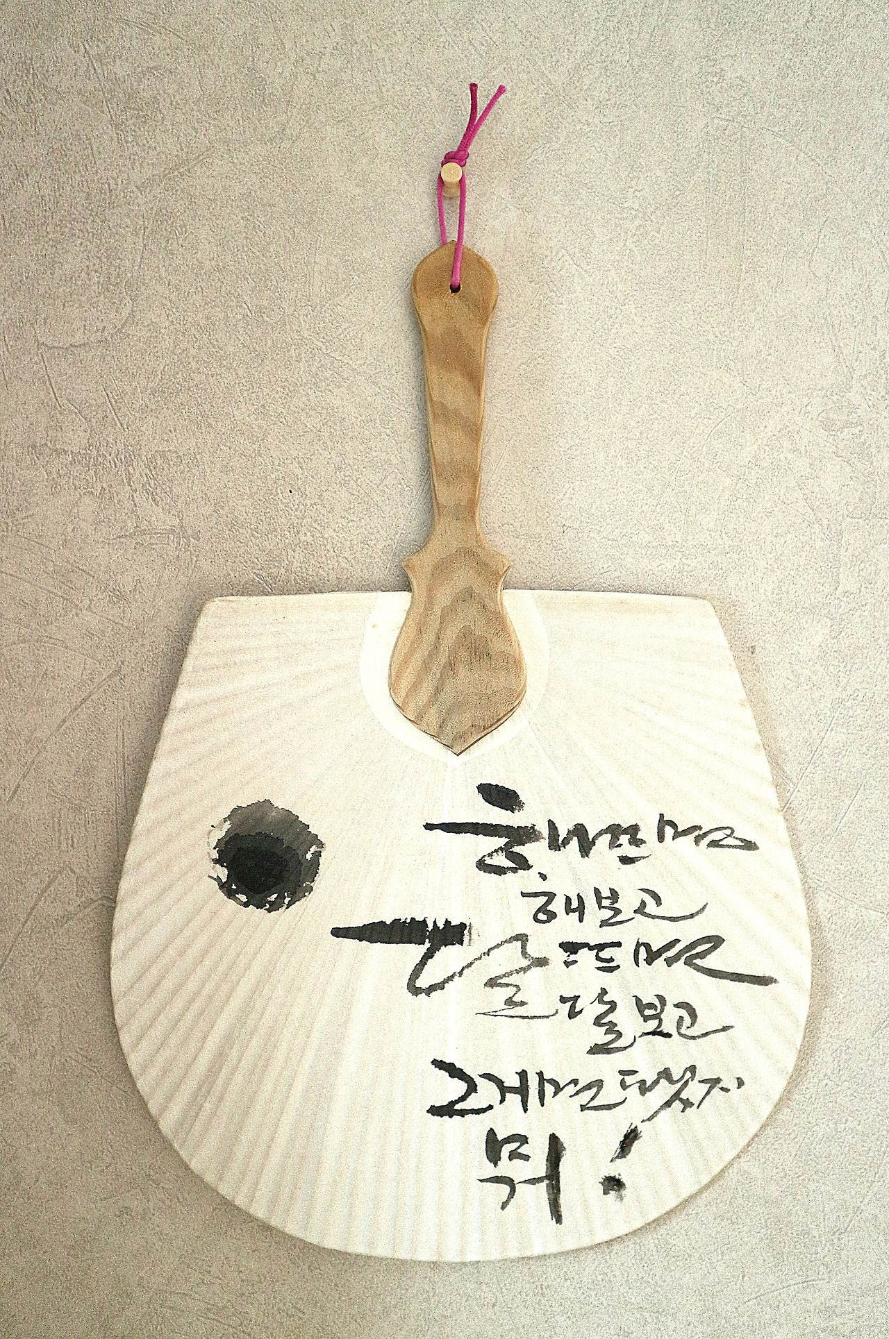 한지 부채에 붓으로 쓴 '해 뜨면 해 보고 달 뜨면 달 보고 그거면 됐지 뭐!'란 글씨입니다. AI에게 글에 대한 설명과 글씨의 작품성에 대해 물어보았습니다.
