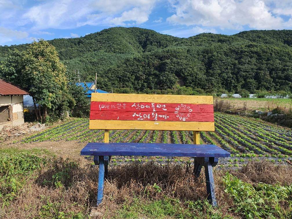 마을 면사무소에서 동네 분들이 앉아 쉴 수 있도록 여러 곳에 벤치를 만들어 놓았습니다. 그리고 벤치가 덜렁 놓여있어 너무 심심하니 벤치에 글을 하나씩 써달라 부탁해 페인트 통을 차에 싣고 마을을 돌아다니며 놓여 있는 벤치에 어울리는 글을 지어 손글씨를 썼었습니다.